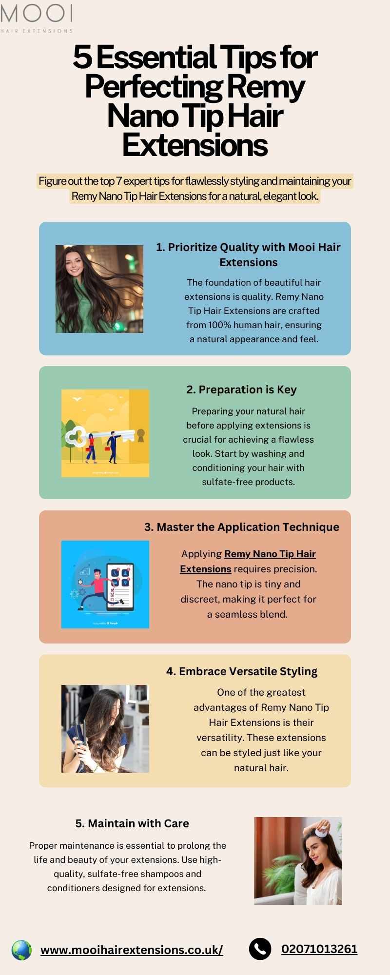 Learn 5 key points from Mooi Hair Extensions to achieve flawless Remy Nano Tip Hair Extensions. Get tips on how to prepare, apply, style, maintain, and store your extensions so they look perfect and natural. Take tips from a professional to get salon-quality results at home. Mooi Hair Extensions can completely change your hair right now. For more information visit the website.